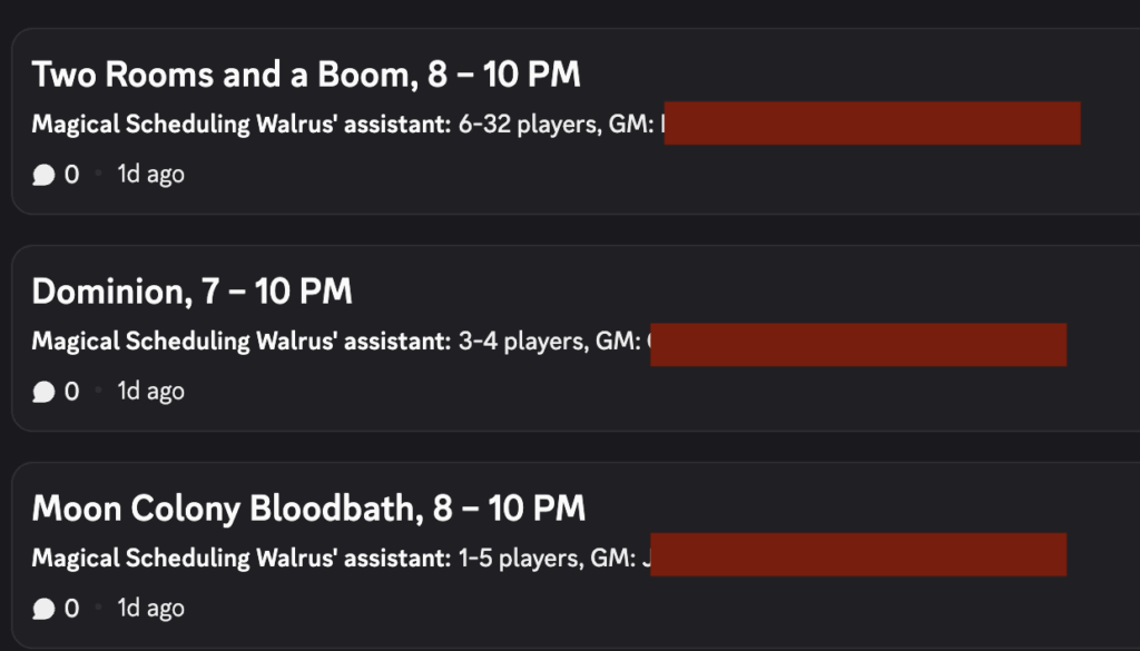 Inside each forum, you’ll find a complete list of all scheduled events. Here’s a sample (with GM names redacted):