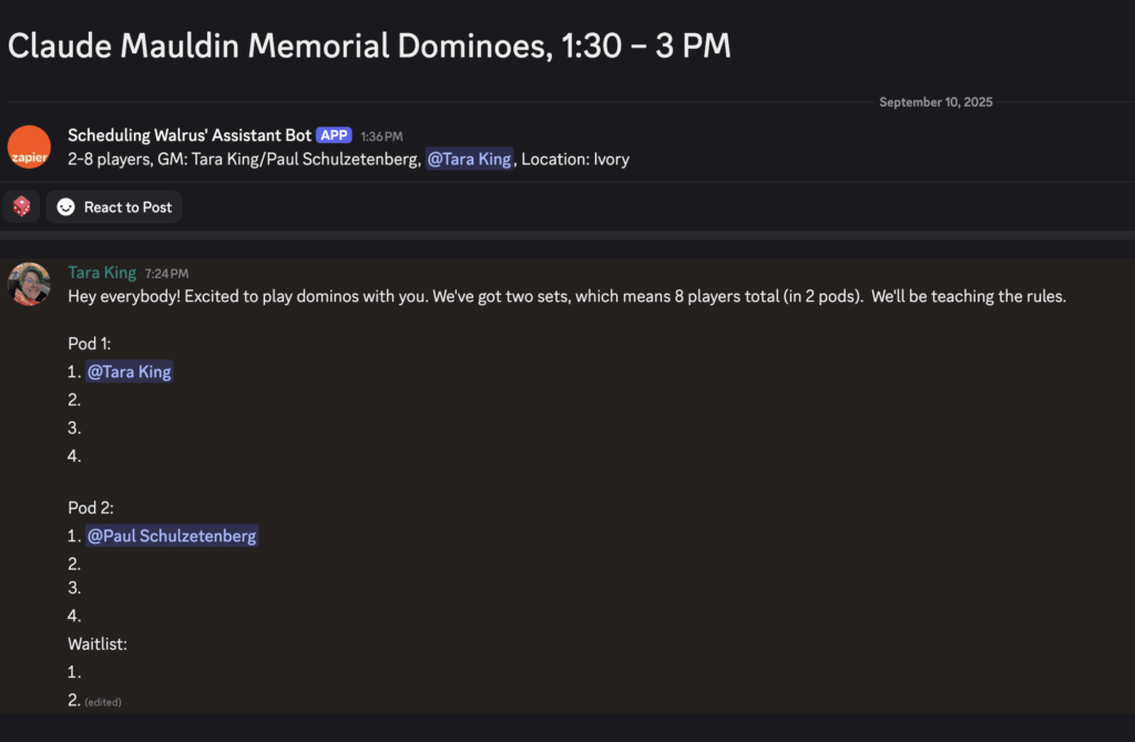 - You can use this thread to communicate with players the day of your game. If someone you expected isn’t there, you can ping them — or if you’re short a player, you can always let the waitlist folks know there is new space in your game.