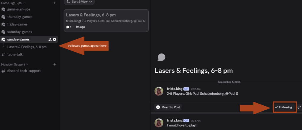 - Click into the forum and post a message with your interest or any questions you have. You can also claim a spot for a friend on Discord–please say who the other player is.